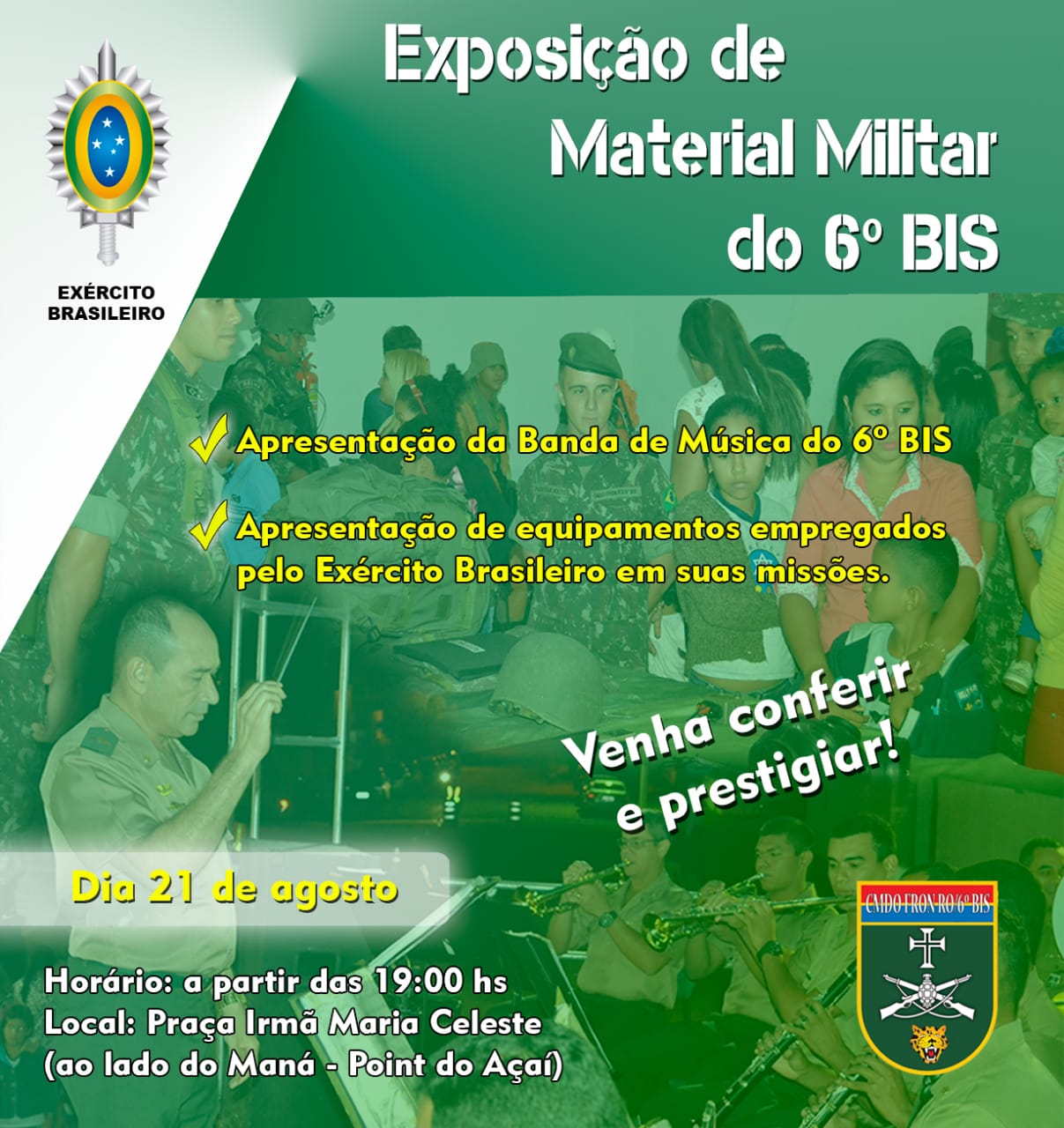 Tenente Coronel Bastos, comandante do 6º BIS ( Batalhão de Infantaria de Selva ), em Guajará-Mirim, convida para a Exposição de Material Militar. O evento acontece no próximo dia 21 de agosto, á partir das 19h, na praça Irmã Maria Celeste, centro de Guajará. A exposição apresenta equipamentos usados pelo Exército Brasileiro em suas missões. Durante as visitas o público poderá também apreciar uma boa música com a Banda do 6º BIS.
