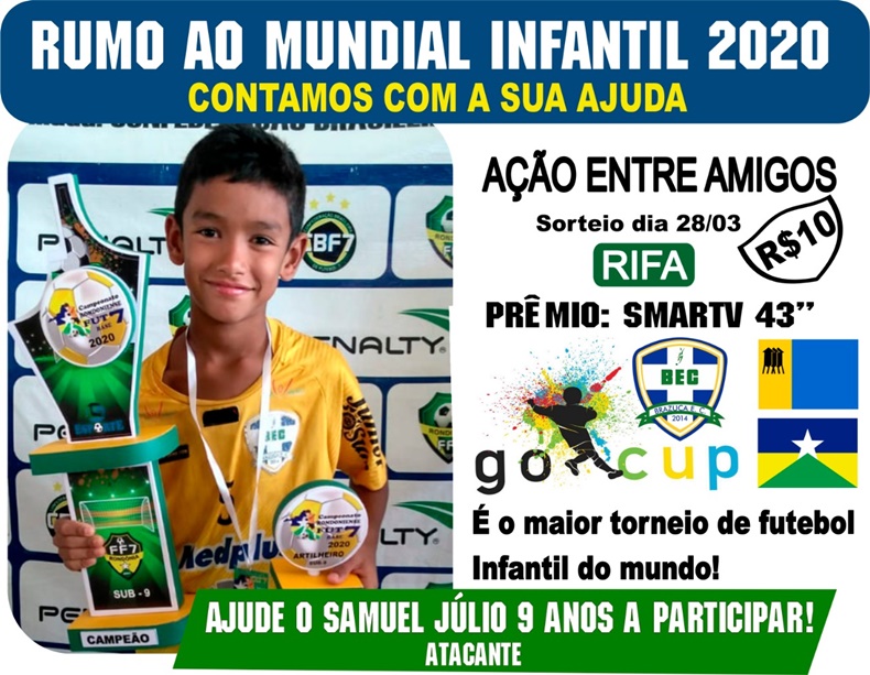 O pequeno Samuel Júlio, de 09 anos, está promovendo uma rifa de uma TV “43”. O sorteio acontece no dia 28 de março. A rifa custa R$ 10,00 e toda a arrecadação será para custear a viagem de Samuel para o “Go Cup”, maior torneio infantil de futebol do mundo.