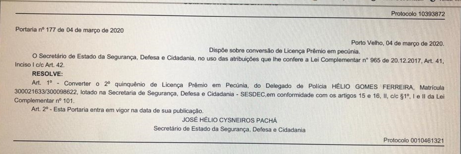 Vale lembrar que o Secretário Adjunto da Segurança, Hélio Gomes Ferreira, também foi agraciado com pagamento de uma licença prêmio já durante a pandemia. A Portaria autorizando o pagamento foi assinada pelo secretário José Hélio Pachá em 04 de março.