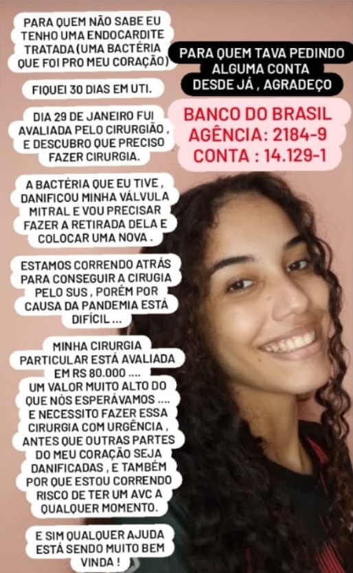 Parentes e amigos de Pâmela Fink Ambrósio estão unidos em busca de ajuda para a realização de uma cirurgia cardíaca. A jovem precisa arrecadar 80 mil reais para conseguir fazer a operação.