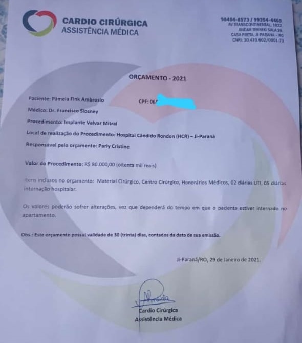 O caso de Pâmela é grave e ela precisa realizar a cirurgia o mais rápido possível. Quinze pessoas estão na frente dela pelo SUS o que inviabiliza aguardar o procedimento pelo serviço público.