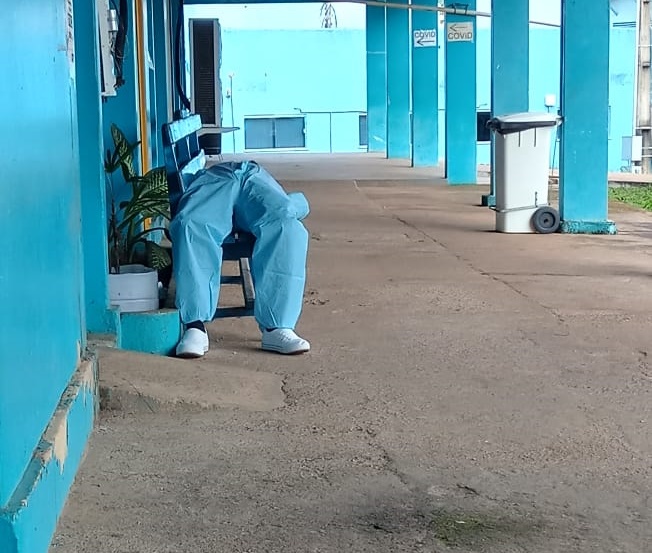 Os Funcionários da unidade de saúde estariam trabalhando com medo após a morte de duas funcionárias por coronavírus. O estresse e o cansaço também estariam comprometendo o atendimento. O leitor mandou foto de um servidor esgotado, dormindo em um banco em frente ao prédio da policlínica.