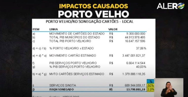 Com imagens em um telão, Eyder Brasil pontuou os prejuízos, somente em 2019, para os municípios de Porto Velho, Ji Paraná, Cacoal e Vilhena. No total, essas cidades deixaram de arrecadar mais de 50 milhões de reais porque o governo não mandou os arquivos de cartões.