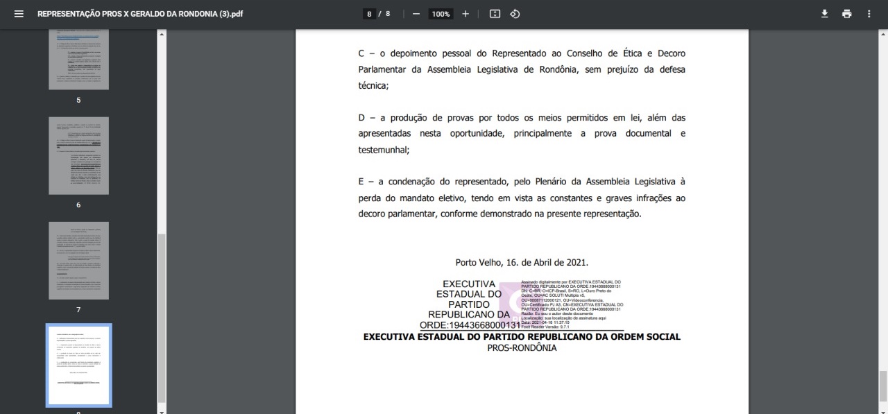 A Executiva Estadual do Partido Republicano da Ordem Social ( PROS) representou judicialmente por quebra de decoro parlamentar contra o deputado Geraldo da Rondônia, que pertence à sigla. A medida está embasada legalmente no Regimento Interno e Código de Ética do partido.