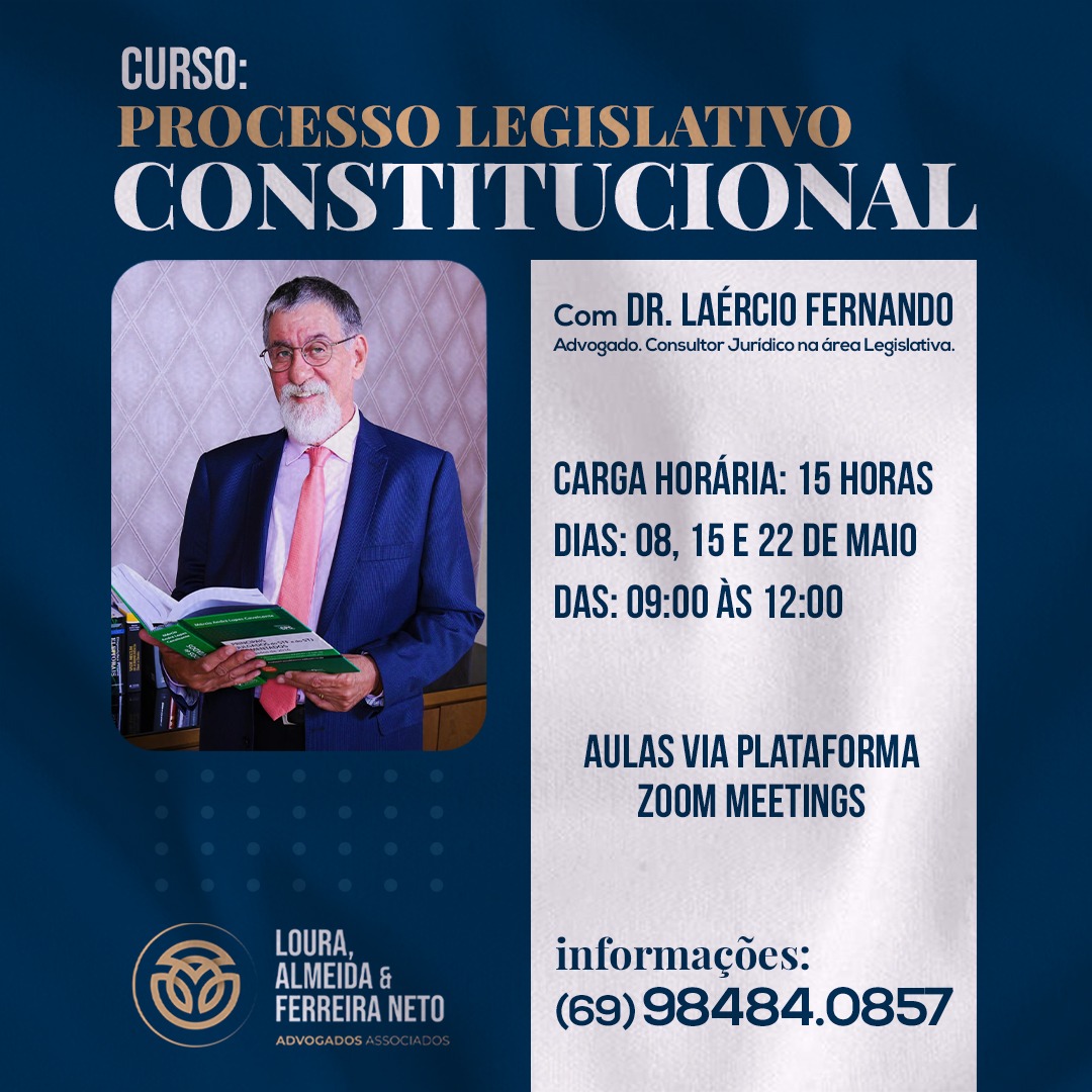 Quem quiser ampliar conhecimentos em Processo Legislativo Constitucional, o maior especialista da Região Norte do país, advogado Dr. Laércio Fernando de Oliveira Santos, estará ministrando um Curso/Treinamento. O evento acontece nos dias 08/15 e 22 de Maio. O curso será Online, AO VIVO, na Plataforma