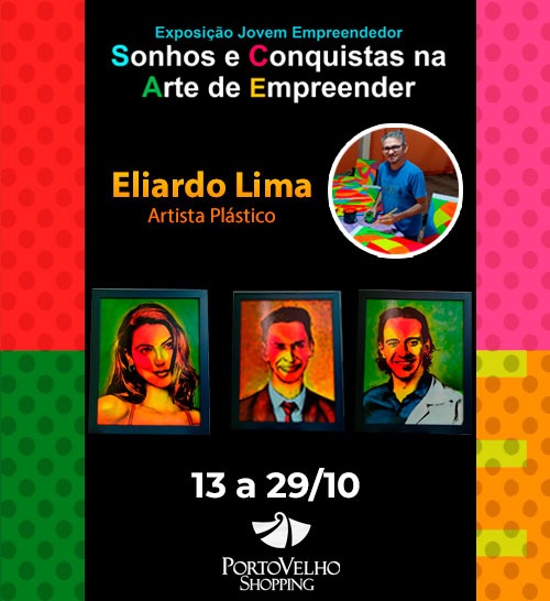 O Porto Velho Shopping será palco de 13 a 29 de outubro da Exposição Jovem Empreendedor - Sonhos e Conquistas na Arte de Empreender. A mostra do artista plástico Eliardo Lima, que lança a técnica Pop Art Amazônia, reúne 32 obras, retratando histórias inspiradoras no empreendedorismo. O evento começa daqui a pouco, às 10h da manhã.