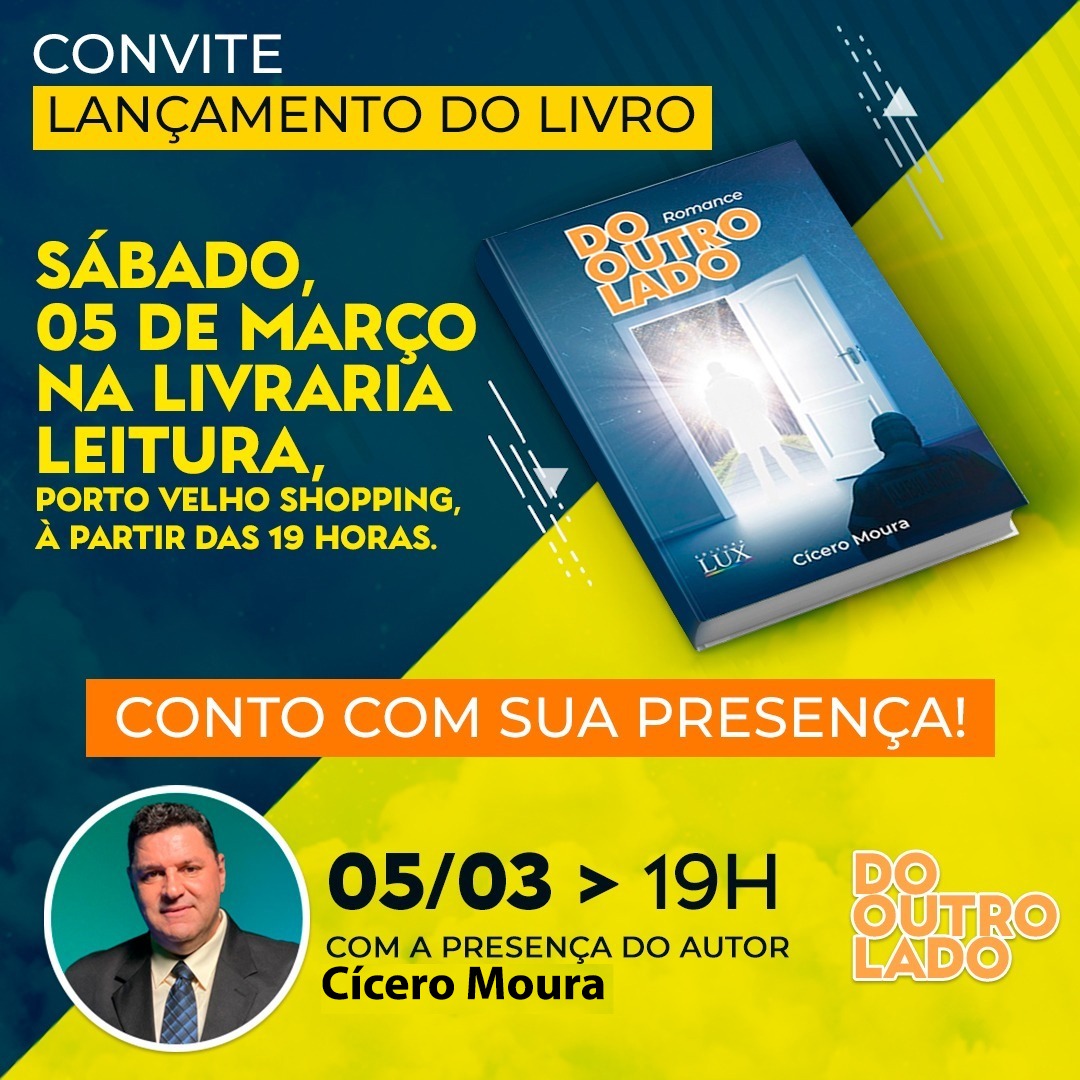 Finalmente depois de um período de tanta incerteza, dor e cuidados excessivos, no próximo sábado estarei lançando meu livro “Do Outro Lado” no Porto Velho Shopping. Será às 19 horas, na Livraria Leitura. Espero os amigos por lá!