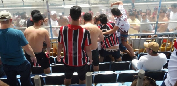 Na reta final do primeiro tempo, torcedores do São Paulo protagonizaram confusão nas cadeiras, em frente à área de imprensa do Pacaembu. Um homem que estava de pé trocou socos com outros que pediam para ele se sentar. A polícia interveio e removeu os três brigões, que deixaram o estádio sob vaias para esclarecimentos. O promotor Paulo Castilho foi o responsável por identificar os protagonistas do incidente.