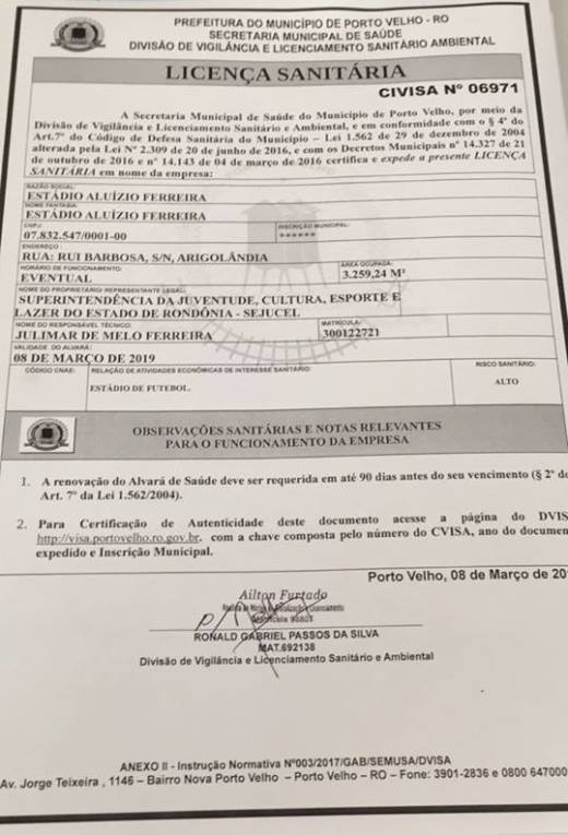 A Licença Sanitária do estádio Aluízio Ferreira foi emitida pela Divisão de Vigilância e Licenciamento Sanitário Ambiental da Prefeitura de Porto Velho e está apto para receber o torcedor no sábado (10) em concordância com o Artigo 20 do Estatuto de Defesa do Torcedor. Rodnei Paes está em Brasília, porém sua equipe esteve acompanhando o desenrolar do imbróglio do local. “A equipe da vigilância sanitária foi ao estádio hoje, sei que pediram para trocar umas caixas de água de amianto por caixas plásticas e vamos fazer”, destacou Rodnei.
