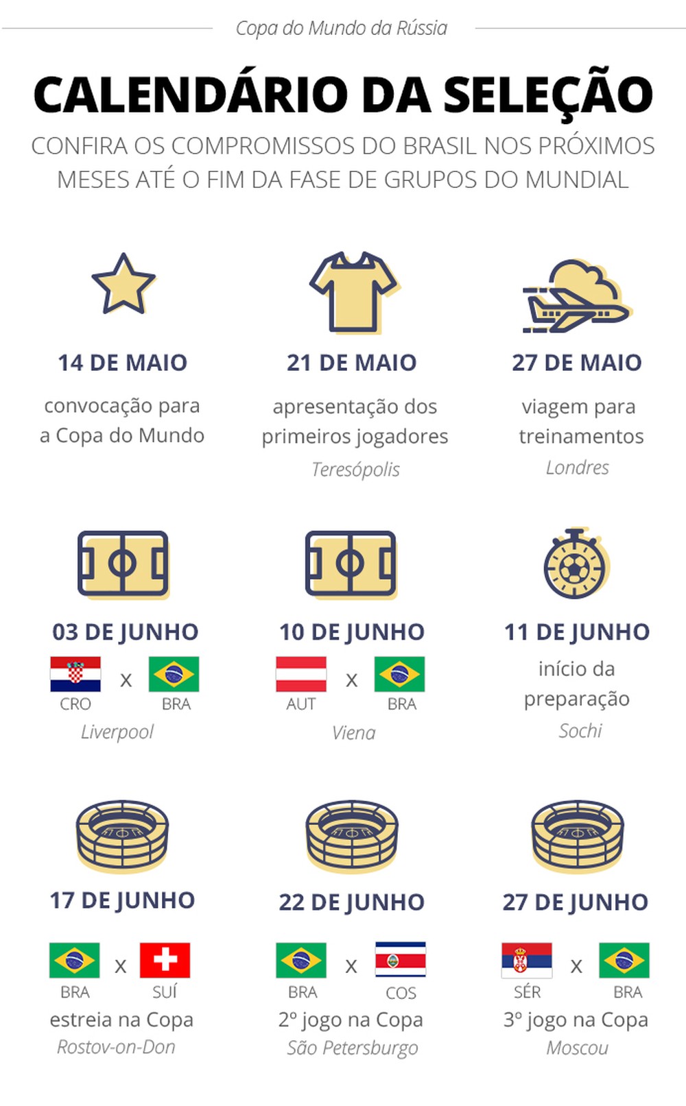 A Seleção chegará a Sochi, cidade russa que hospedará a delegação, na noite do dia 10. O primeiro treino no país da Copa será no dia 11, e dia 15 a equipe viaja a Rostov-on-Don, palco da estreia no Mundial, dia 17, às 15h (horário de Brasília), contra a Suíça.