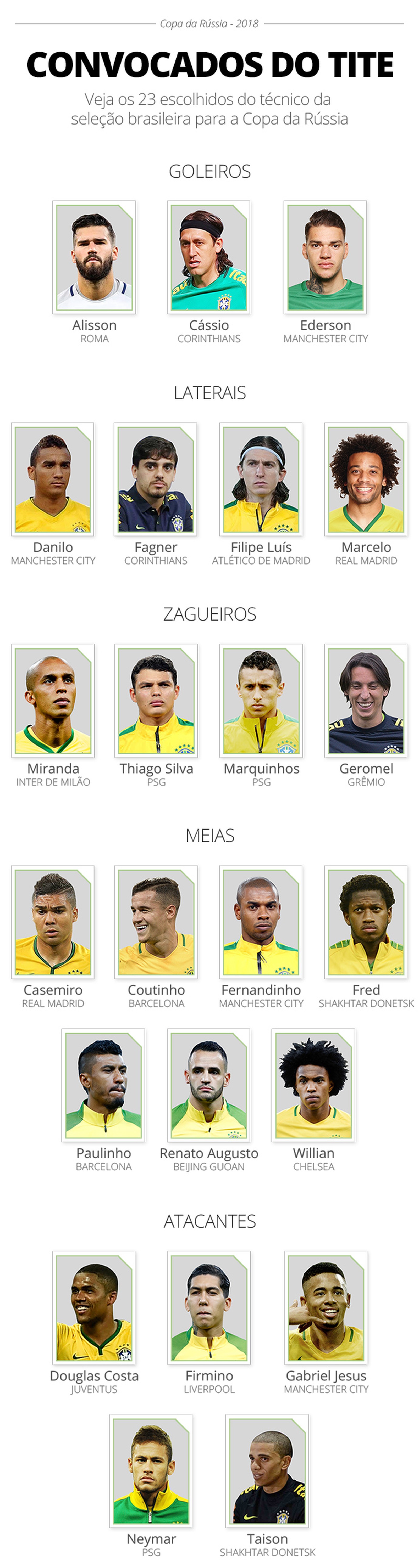É para esse grupo de 23 jogadores que o brasileiro terá de torcer, é por eles que os dedos serão cruzados e as orações feitas entre 14 de junho e 15 de julho. São os nomes deles que serão estampados nas camisas dos fanáticos. São eles os escolhidos por Tite para tentarem o hexacampeonato na Copa do Mundo, na Rússia.