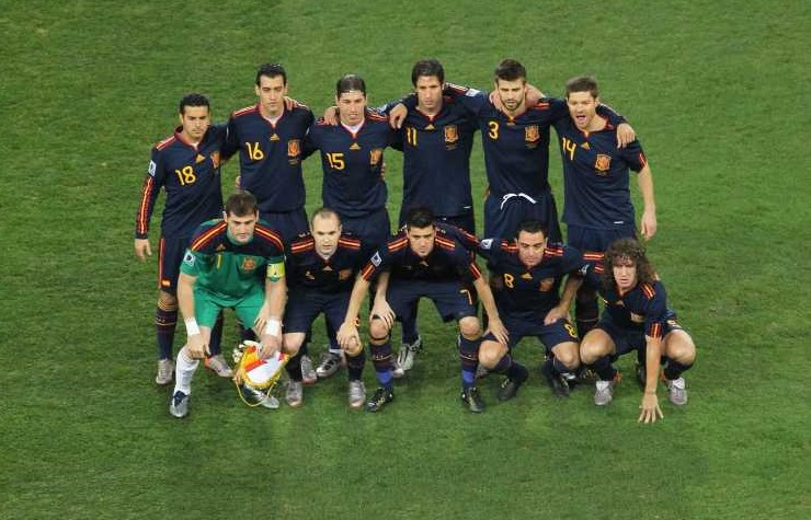 ESPANHA - 2010 - Casillas; Ramos, Piqué, Puyol e Capdevila; Xabi Alonso, Busquets, Pedro, Xavi e Iniesta; Villa.