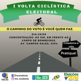 A Escola Judiciária do Tribunal Regional Eleitoral de Rondônia (EJE-RO) convida os magistrados, servidores, colaboradores, familiares da Justiça Eleitoral e toda a população rondoniense para, no dia 29 de setembro, próximo sábado, participar da I Volta Ciclística Eleitoral, que iniciará às 16 horas na avenida Campos Sales, em frente ao Comando Geral do Corpo de Bombeiros Militares do Estado de Rondônia, em Porto Velho.