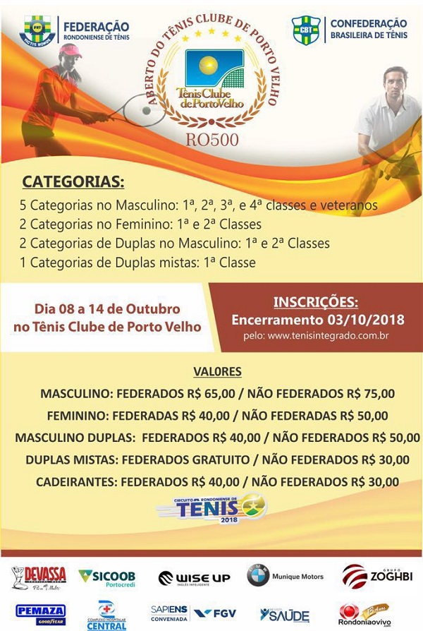 Lembrando a todos os tenistas que o Aberto do Tenis Clube - RO 500 é o último torneio em Porto Velho antes da “Copa dos Campeões Sicoob Portocredi”