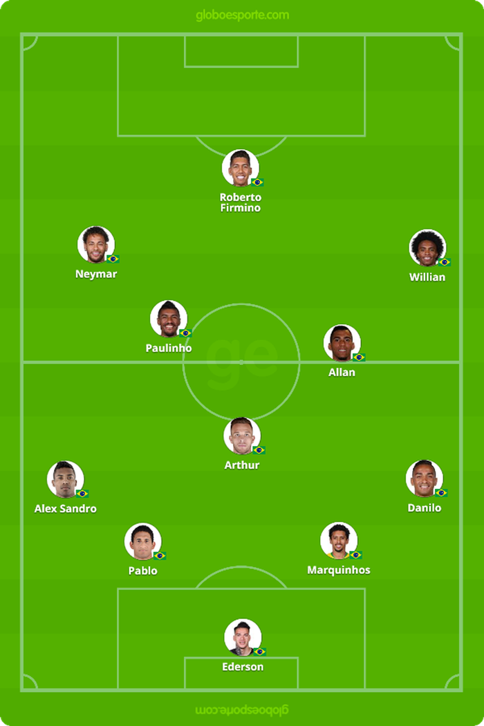 BRASIL: Ederson, Danilo, Marquinhos, Pablo e Alex Sandro; Arthur, Allan e Paulinho; Willian, Neymar e Firmino. Técnico: Tite.