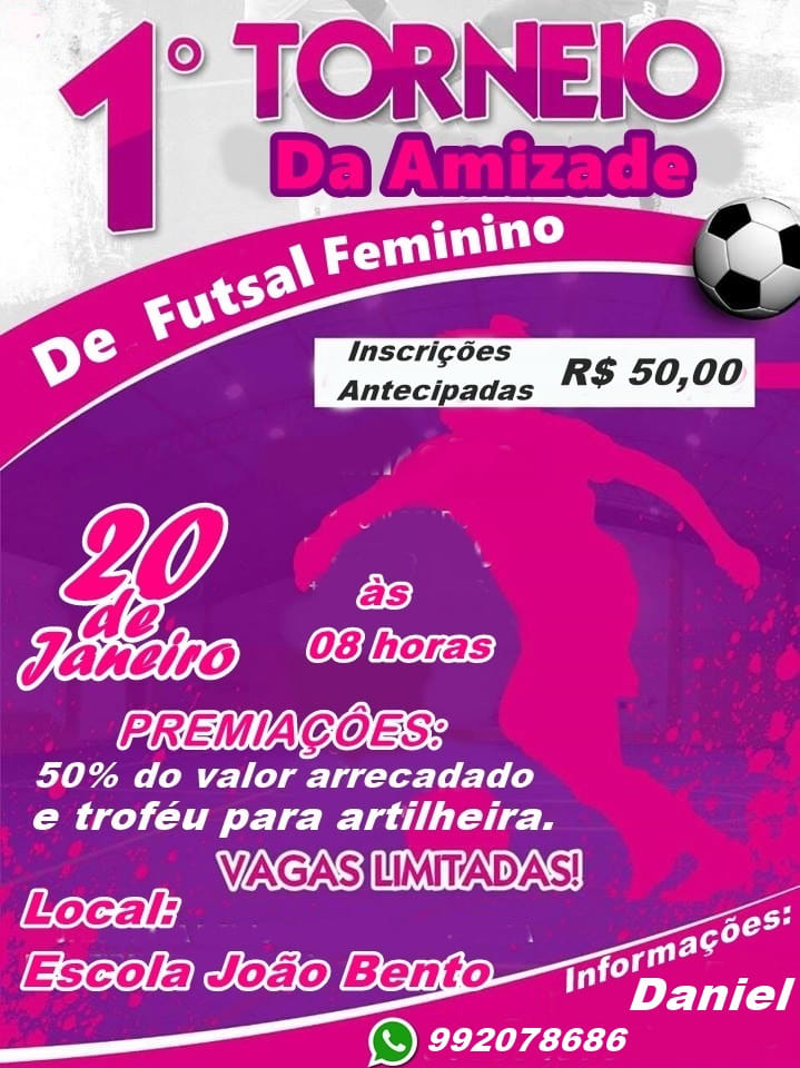 Vem aí a primeira edição do Torneio da Amizade de Futsal Feminino O valor das inscrições é de R$50,00, no dia 20 de janeiro a partir das 8 horas. Os jogos serão na Escola João Bento em Porto Velho. Informações pelo telefone: (69) 99207-8686 com Daniel.