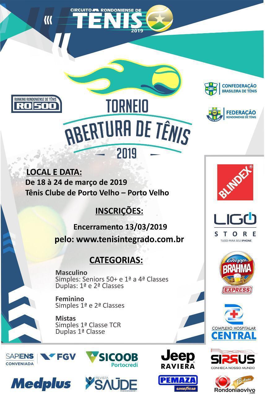A Federação Rondoniense de Tênis informa que para iniciar a temporada de 2019 realizará o Torneio de Abertura 2019 – 500 CRT, entre os dias 18 e 24 de março, no Tênis Clube.