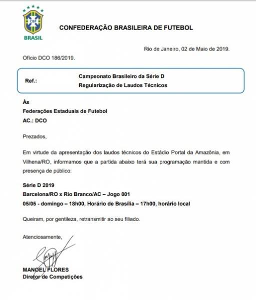 Confira abaixo a íntegra do Ofício da CBF que libera o Estádio: