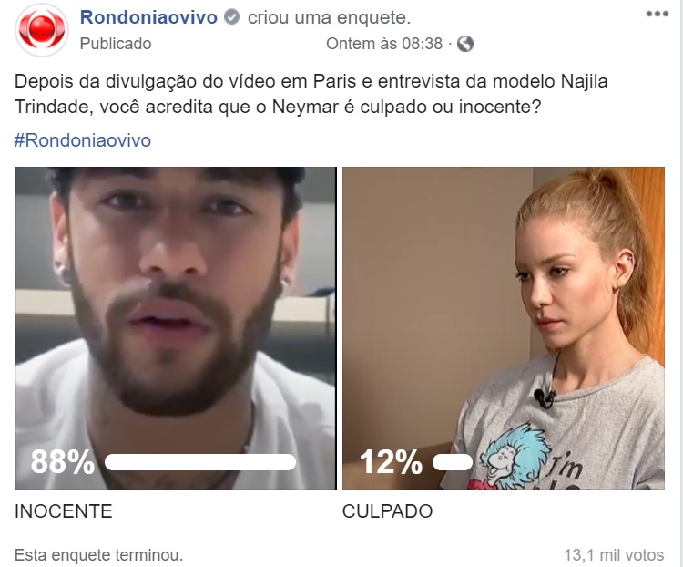 O Rondoniaovivo disponibilizou uma enquete a seus internautas nesta última quinta-feira (6) através de sua página no Facebook para entender um pouco sobre como a comunidade está enxergando o recente escândalo envolvendo o nome do jogador de futebol, Neymar.