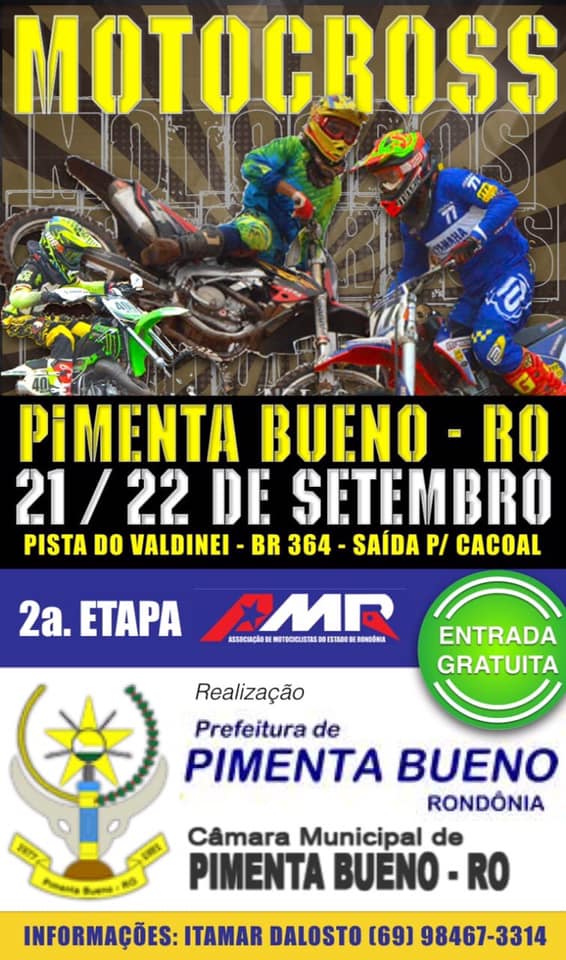 Dando continuidade ao calendário de atividades promovidas pela Associação de Motociclistas de Rondônia – AMR, nos dias 21 e 22 de setembro, a cidade de Pimenta Bueno recebe o circo do MX, com a realização da 2ª etapa do Campeonato AMR de Motocross 2019. A prova será disputada na pista do Valdinei, na saída para Cacoal. A entrada será franca ao público, mas que puder poderá doar um quilo de alimento não perecível, que será todo o arrecado será revertido em cestas básicas a serem repassadas a entidades assistenciais.