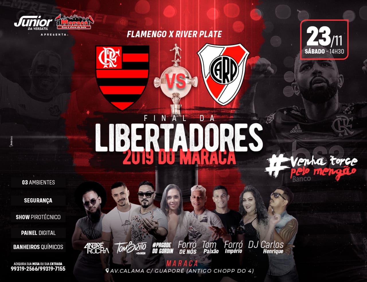 Serão 3 ambientes, 3 telões de LED, 6 atrações, decorações, segurança, queima de fogos, banheiros quimícos e muito mais. E aí vai ficar de fora? Torça pro seu time em grande estilo!!!