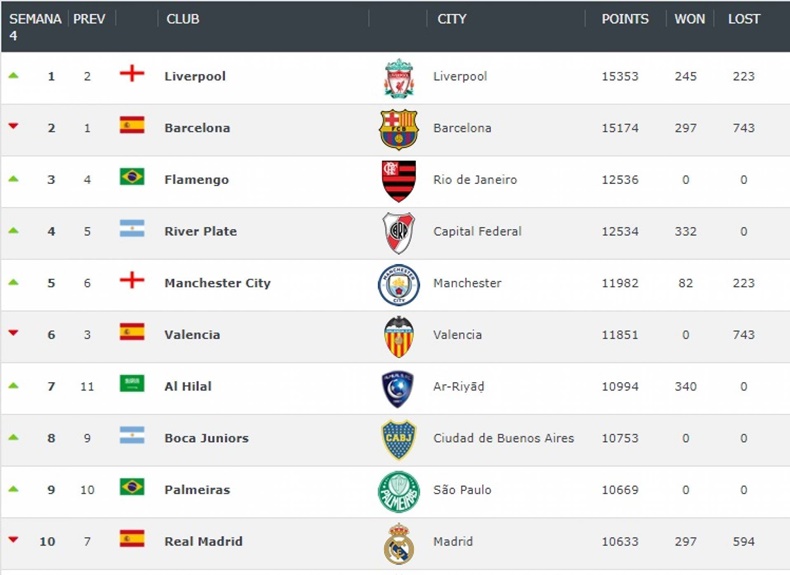 O Rubro-Negro ganhou uma posição em relação à última lista, ultrapassando o Valência-ESP. Agora, a equipe de Jorge Jesus está atrás apenas de Liverpool e Barcelona.