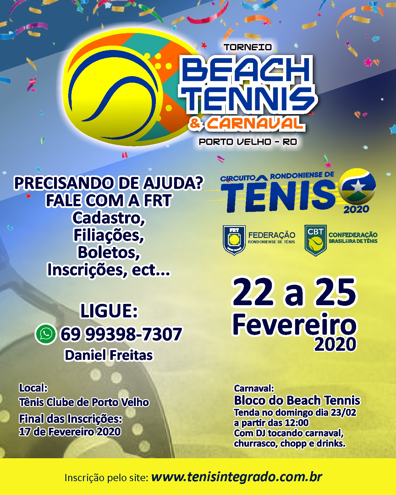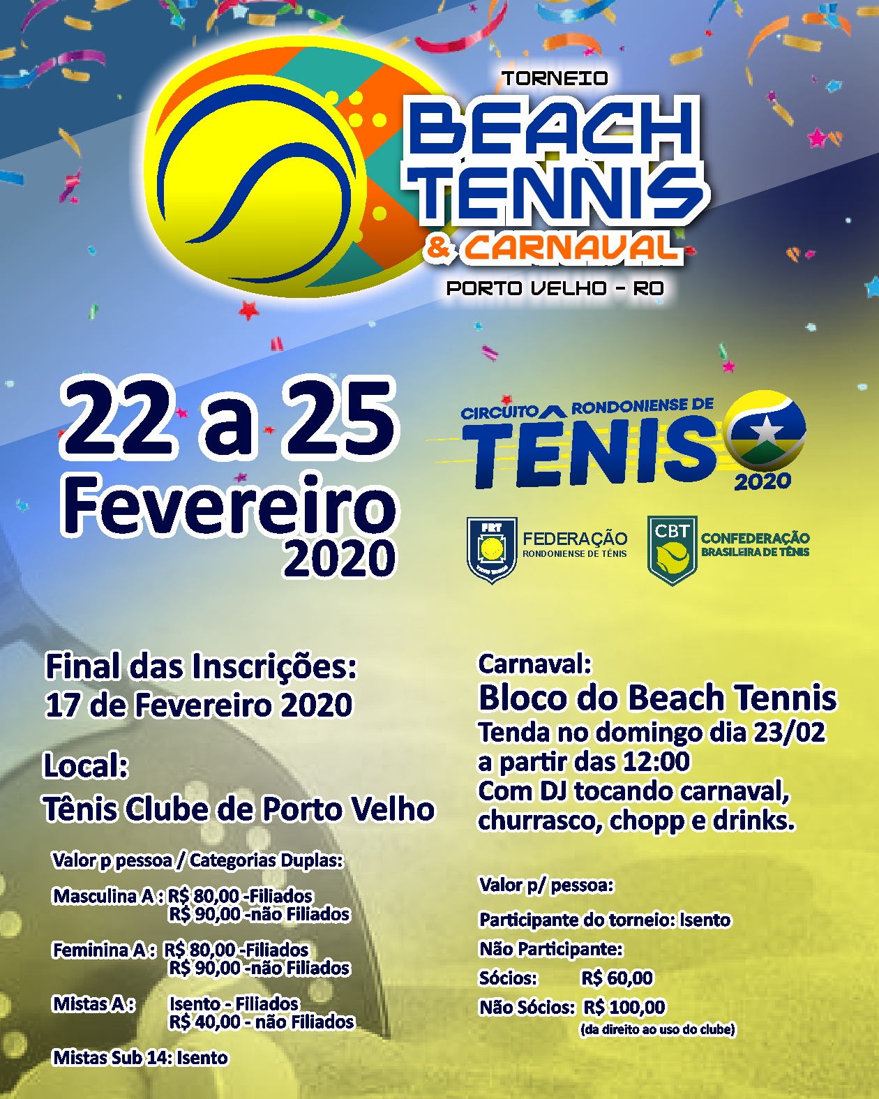 A Federação Rondoniense de Tênis informa que para iniciar a temporada de 2020 realizará o Torneio Beach Tennis & Carnaval, entre os dias 22 e 25 de fevereiro, no Tênis Clube em Porto Velho.