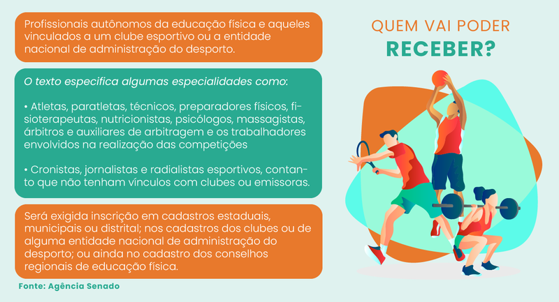 Segundo o documento, algumas especialidades são definidas para o recebimento do auxílio, como os atletas, paratletas, técnicos, preparadores físicos, fisioterapeutas, nutricionistas, psicólogos, massagistas, árbitros e auxiliares de arbitragem e os trabalhadores envolvidos na realização das competições, entre outros. Além disso, o Senado Federal incluiu cronistas, jornalistas e radialistas esportivos, contanto que não tenham vínculos com clubes ou emissoras.
