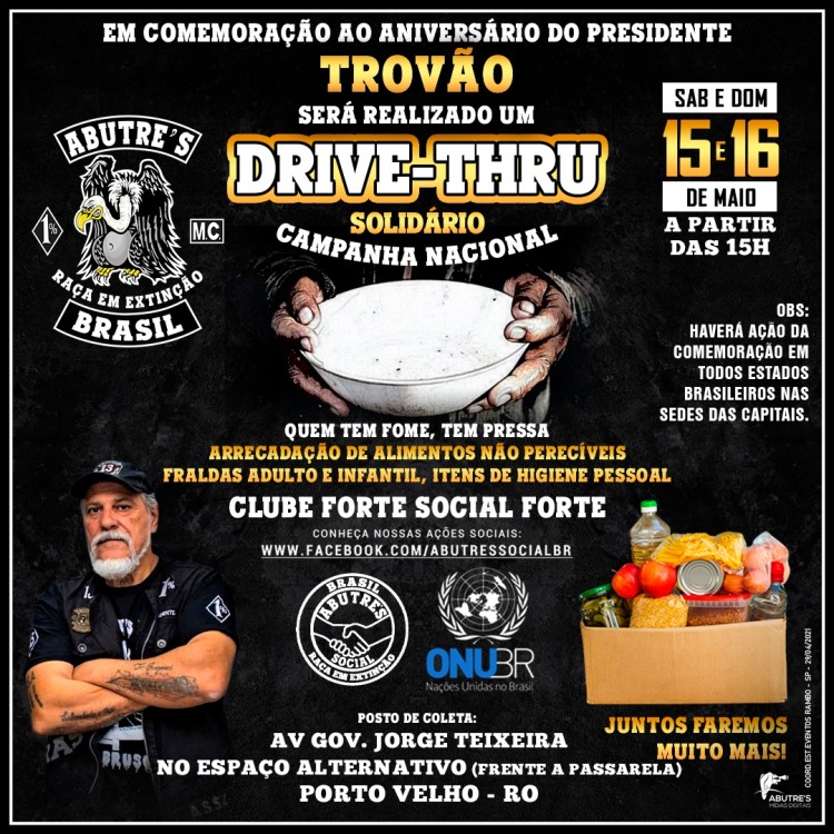 Abutre's Moto Clube - Raça em Extinção Rondônia realizará mais uma ação social para arrecadar itens alimentícios não perecíveis, fraldas descartáveis adultos e infantil e itens de higiene pessoal para serem doados as pessoas necessitadas economicamente no estado.