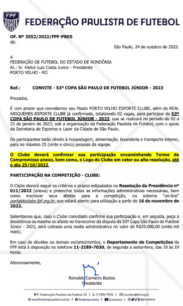 Confira o ofício confirmando a a segunda vaga para Rondônia na Copa São Paulo de Futebol Júnior.