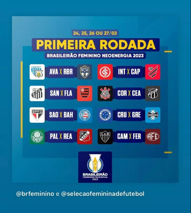A CBF, Confederação Brasileira de Futebol, através da Diretoria de Competições divulgou, a tabela básica do Brasileirão Feminino Neoenergia 2023. No documento constam todas as datas programadas para os confrontos, assim como o caminho das equipes da 1ª a 15º rodada da competição. A primeira rodada começa no dia 24/02 (sexta-feira). Além da trajetória de cada equipe na competição, a entidade também publicou o Regulamento Específico da Competição (RGC) e o Plano Geral de Ação (PGA).