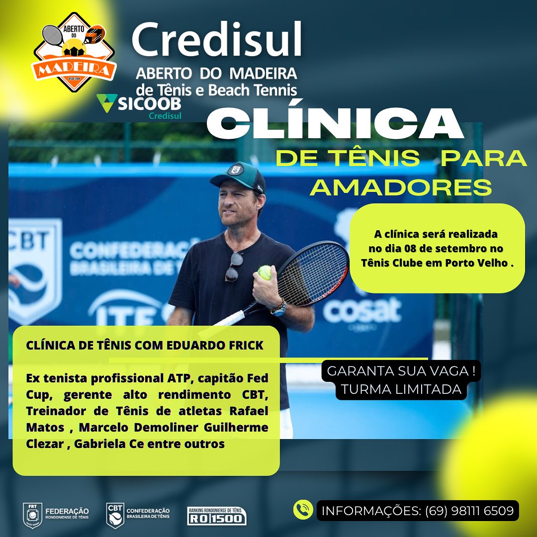 Além do torneio será realizada também a Clínica de Tênis para Amadores, uma parceria entre a FRT e a CBT (Confederação Brasileira de Tênis), com a presença de Eduardo Frick que ministrará a Clínica, ele é ex-tenista profissional ATP, Capitão FED CUP, Gerente de alto rendimento CBT, ele trará para Rondônia um conteúdo voltado aos tenistas amadores que buscam aperfeiçoar os conhecimentos no esporte. Teremos também, uma Capacitação para professores de Beach Tennis Nível Amarelo com o Professor Juca Russo, grande formador de atletas campeões, possui vasta experiência á frente da Seleção Juvenil do Brasil.