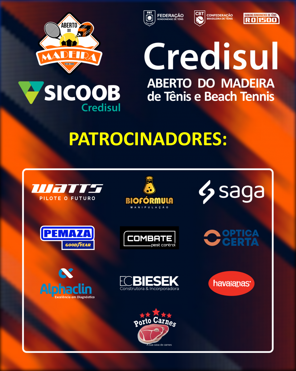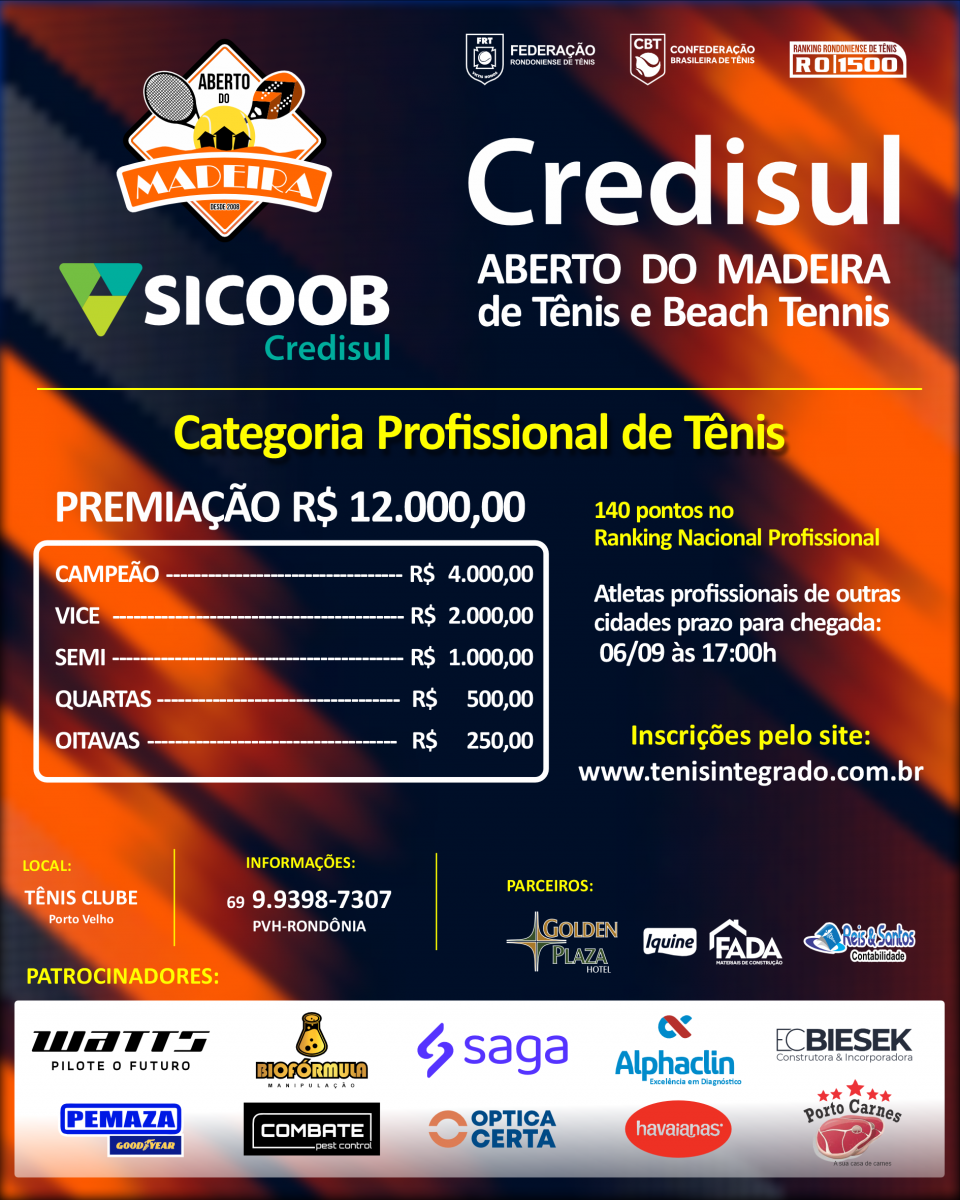 Entre os dias 04 e 09 de setembro será realizado em Porto Velho, nas quadras do Tênis Clube, a competição de Tênis e Beach Tennis mais esperada do ano. O Credisul Aberto do Madeira de Tênis e Beach Tennis é um evento esportivo já tradicional em Porto Velho e conta com a participação de vários tenistas e beach tenistas do interior, bem como de outros estados. O torneio terá premiação em dinheiro em mais de R$24.000,00 em prêmio, entre Campeões e vices, além dos terceiros e quartos colocados de cada categoria que também serão premiados. Já na Categoria Amadora a premiação serão troféus e medalhas.