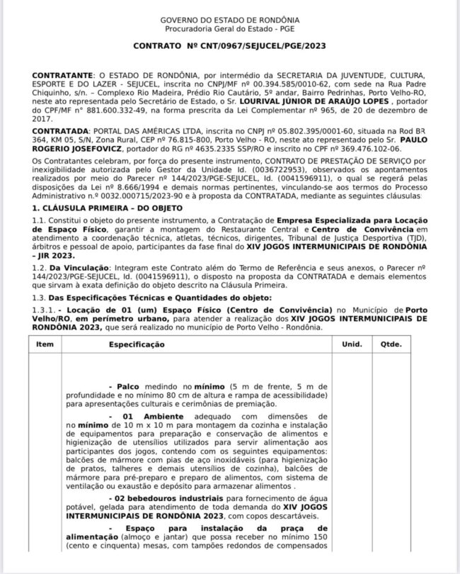 O Portal das Américas, de acordo com o contrato, deve fornecer um palco para apresentações culturais e cerimônia de premiação, além de espaço para instalação de cozinha industrial e espaço para instalação de praça de alimentação para 150 mesas. O valor do contrato é R$ 513.500,00.