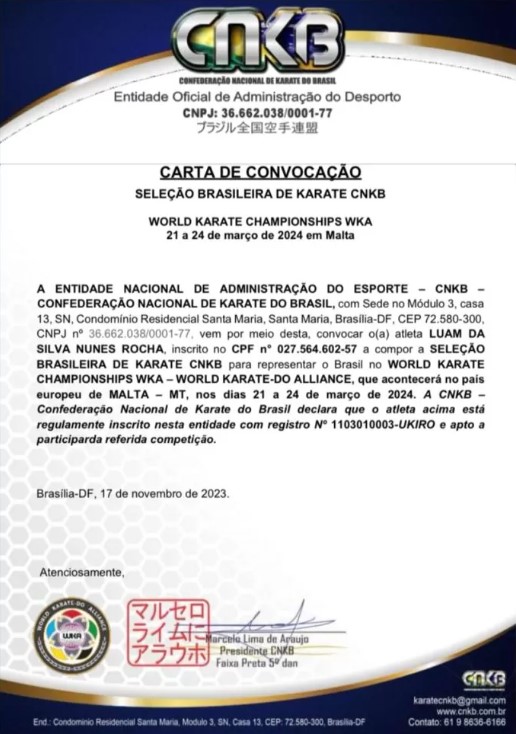 A convocação é de grande importância para os atletas que vão se esforçar para estarem lá. Essa é a conclusão de um trabalho de excelentes parcerias entre os pais, família, amigos e patrocinadores que graças a essa ampla visão possibilitou nossos alunos a convocação e oportunidade de participarem de uma competição a nível mundial em um país Europeu.