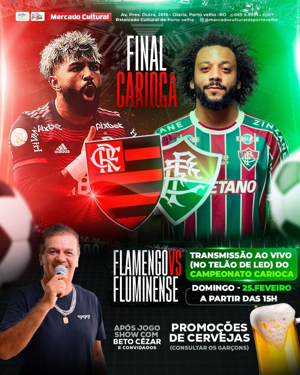 "Traga a sua família para assistir no telão de LED o clássico carioca entre Fla X Flu, neste domingo, dia 25, às 15h, aqui nesse nosso espaço público, histórico e turístico da capital rondoniense", convidou o empresário Sinezio Tapajós, permissionário do box Dourado do Madeira, localizado no Mercado Cultural de Pvh, acrescentando que após o jogo, terá o melhor do pagode e samba com Beto Cezar e convidados. Às 20h, prossegue com show de Alexandre Nery.