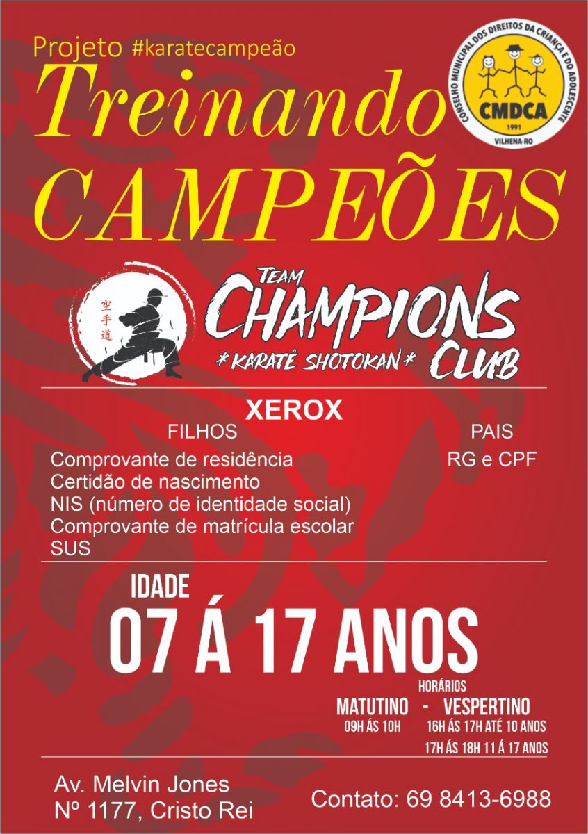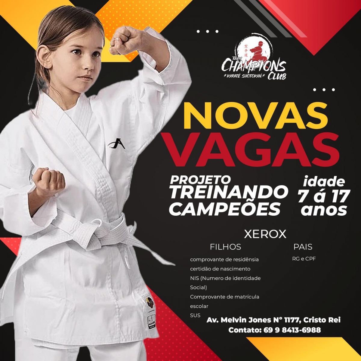 O Projeto Treinando Campeões, promovido pela Associação de Artes Marciais Chapions Club, em parceria com o Conselho Municipal da Criança e do Adolescente e Prefeitura de Vilhena, está com inscrições abertas a partir desta segunda-feira (6). A iniciativa, voltada para crianças e adolescentes de 7 a 17 anos, tem como objetivo proporcionar inclusão social por meio do karatê, promovendo saúde, disciplina e cidadania. O público visado são crianças e jovens que não tenham condições de arcar com o custo do treinamento.