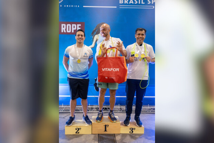 FOTO: Samuel ocupou o terceiro lugar do pódio ao lado de outro brasileiro e um argentino. Reprodução de acervo pessoal.
