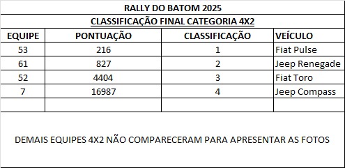 A largada aconteceu às 9h, em frente à concessionária Fiat Autovema, e a chegada foi no Amazon Park, localizado no km 7 da BR-319, pouco depois do meio-dia. Exclusivo para mulheres, o rally contou com duas modalidades: a 4x4, voltada para veículos com tração nas quatro rodas, que enfrentaram trechos de atoleiros e obstáculos naturais, e a 4x2, destinada a veículos de tração simples, em um percurso mais leve.