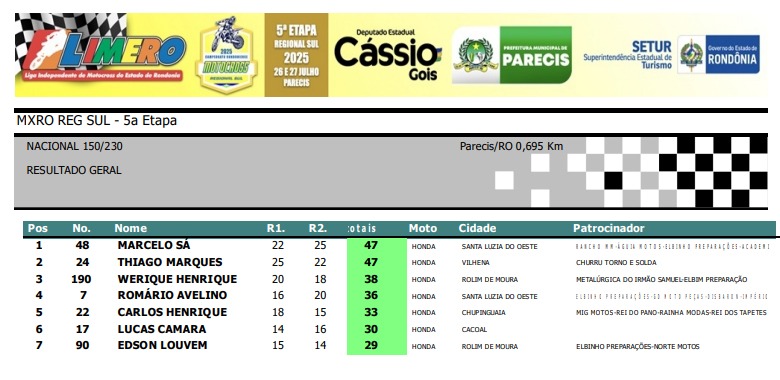 Na Importada MX3, o vilhenense Givanildo Candiotto #9 levou o pódio, em segundo ficou Vitor Ferreira #211, de São Miguel do Guaporé, e na terceira colocação ficou Jacson Cardoso #187, da cidade de Vilhena.