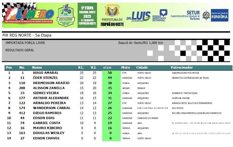 Vitoria de Hugo Amaral #1 de Porto Velho que venceu as duas baterias com certa tranquilidade. Na segunda posição, outro piloto de Porto Velho Eder Stenzel #11 que protagonizou uma disputa eletrizante com piloto Hermerson Araújo #110 de Ariquemes, mostrando que ambos estão em excelente fase. Completaram o pódio Alisson Zanella #200 de Manaus e Sidnei Vieira #33 (Ariquemes)