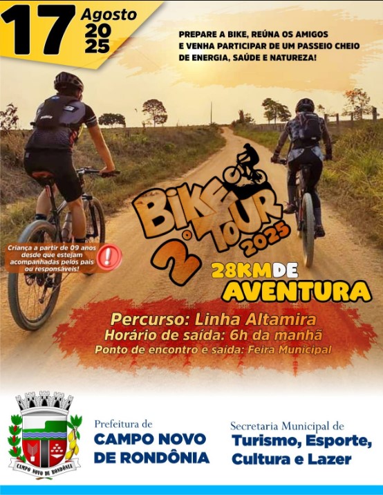 O 2º Bike Tour é realizado pela Prefeitura de Campo Novo de Rondônia, por meio da Secretaria Municipal de Turismo, Esporte, Cultura e Lazer.