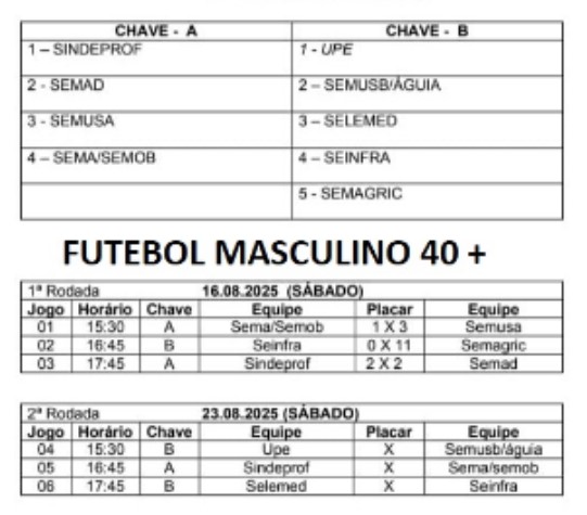 No último sábado, também no campo da sede social do SINDEPROF, começou o Campeonato Master Masculino de Futebol Society, com a realização de três partidas: SEMA/SEMOB 1 x 3 SEMUSA; SEINFRA 0 x 11 SEMAGRIC; e SINDEPROF 2 x 2 SEMAD.