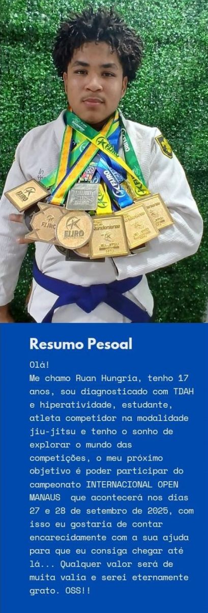 Ruan Hungria é natural de Porto Velho, o estudante tem 17 anos de idade, é diagnosticado com TDAH e hiperatividade e tem o sonho de explorar o mundo das competições no jiu-jítsu.