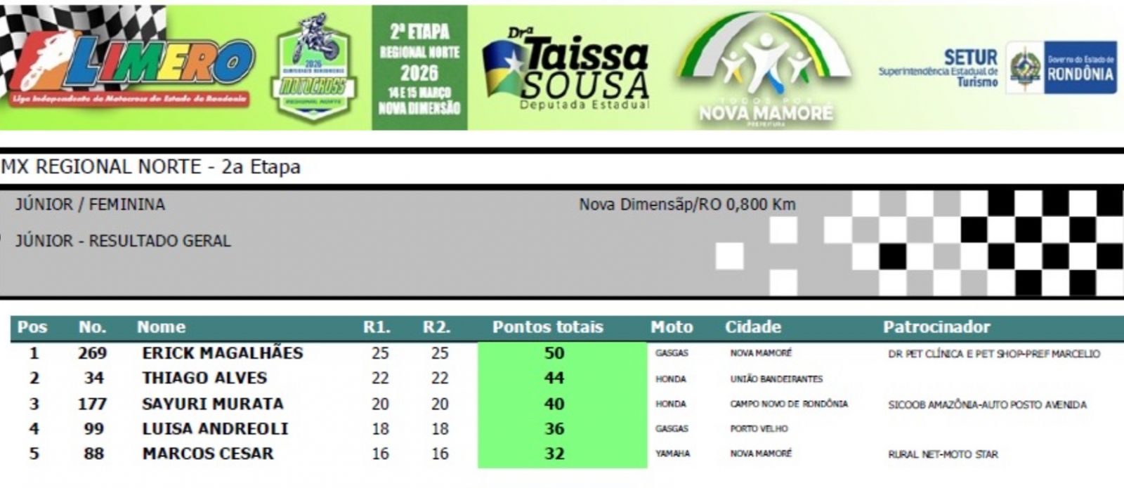 Na segunda colocação ficou o jovem Thiago Alves (#34), de União Bandeirantes. De Campo Novo de Rondônia, a atleta patrocinada pela Sicoob Amazônia e Auto Posto Avenida, Sayuri Murata (#177), ficou em terceiro. Na quarta colocação, a piloto Luisa Andreoli (#99), de Porto Velho. Em quinto ficou o corajoso Marcos Cesar (#88), de Nova Mamoré.