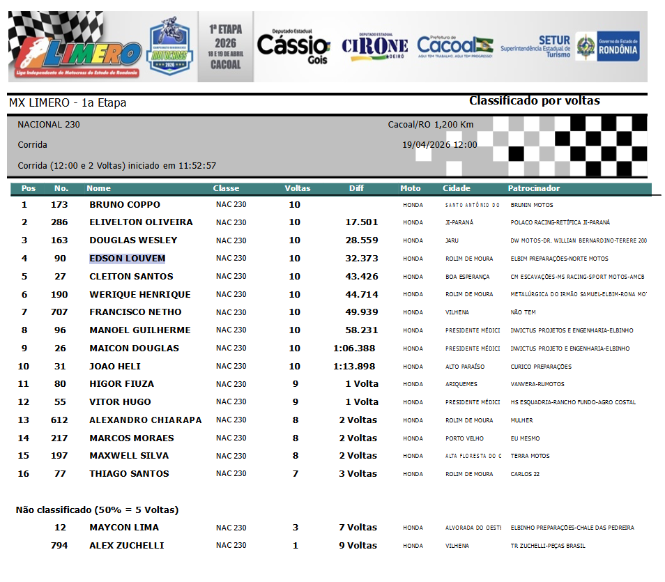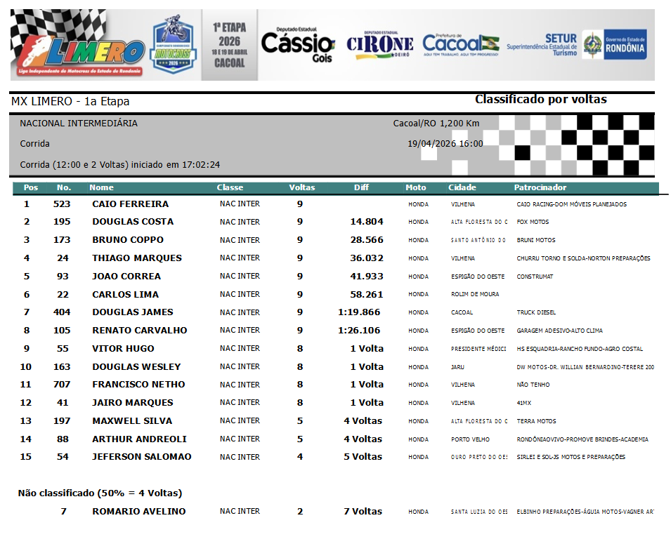 O grande vencedor da Nacional Intermediária foi Caio Ferreira #523 (Vilhena), seguido por Douglas Costa #195 (Alta Floresta do Oeste) na segunda posição. Na Nacional 230, Elivelton Oliveira #286 (Ji-Paraná) e Douglas Wesley #163 (Jaru) fecharam em segundo e terceiro lugares, respectivamente. Na Intermediária, Thiago Marques #24 (Vilhena) e João Correa #93 (Espigão do Oeste) completaram o pódio em quarto e quinto lugares. Já na Nacional 230, Edson Louvem #90 (Rolim de Moura) ficou em quarto, seguido por Cleiton Santos #27 (Boa Esperança) em quinto.