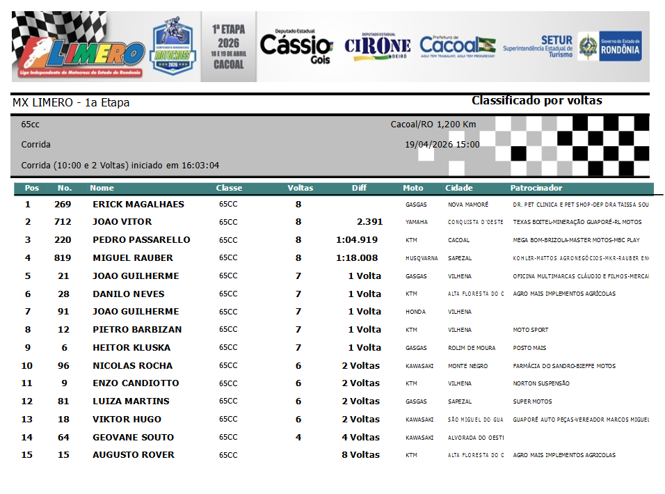 Na 65cc, o "garoto voador" de Nova Mamoré atacou novamente: Erick Magalhães #269 cruzou a linha de chegada em primeiro. Ele foi seguido por João Vitor #712 (Conquista D'Oeste) e pelo talento local Pedro Passarello #220, de Cacoal. Miguel Rauber #819 (Sapezal) foi o quarto colocado e João Guilherme #21 (Vilhena) o quinto.