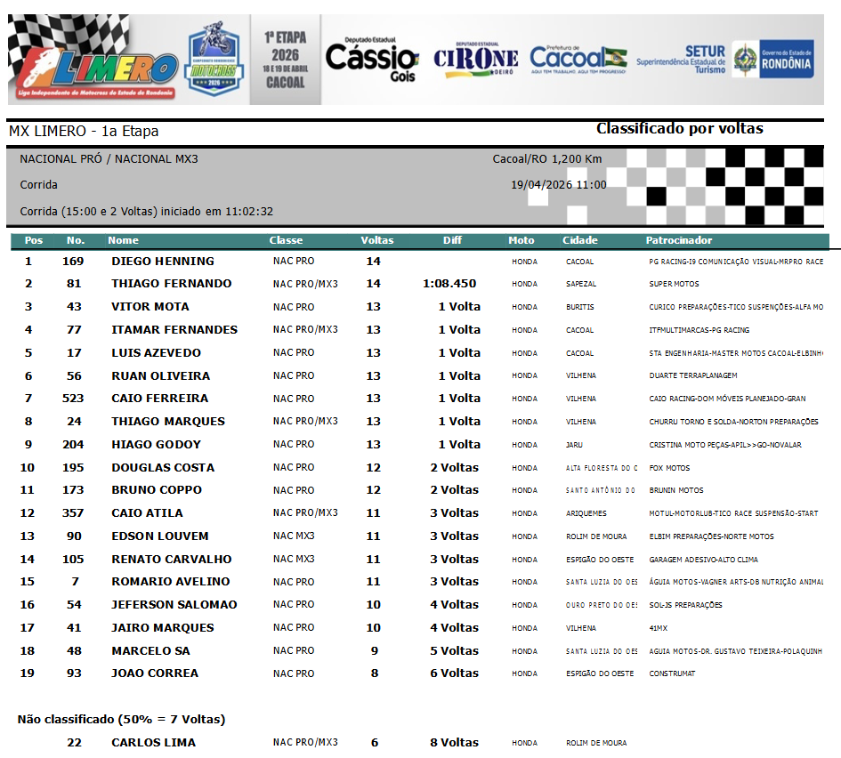 Na disputa conjunta das categorias Nacional Pró e Nacional MX3, Diego Henning #169, que dominou a prova e garantiu a primeira colocação no geral após 14 voltas intensas. Logo atrás, protagonizando um belo desempenho, Thiago Fernando #81, representante de Sapezal, cruzou a linha de chegada em segundo lugar com o patrocínio da Super Motos. O pódio foi completado pelo piloto de Buritis, Vitor Mota #43, na terceira posição.
