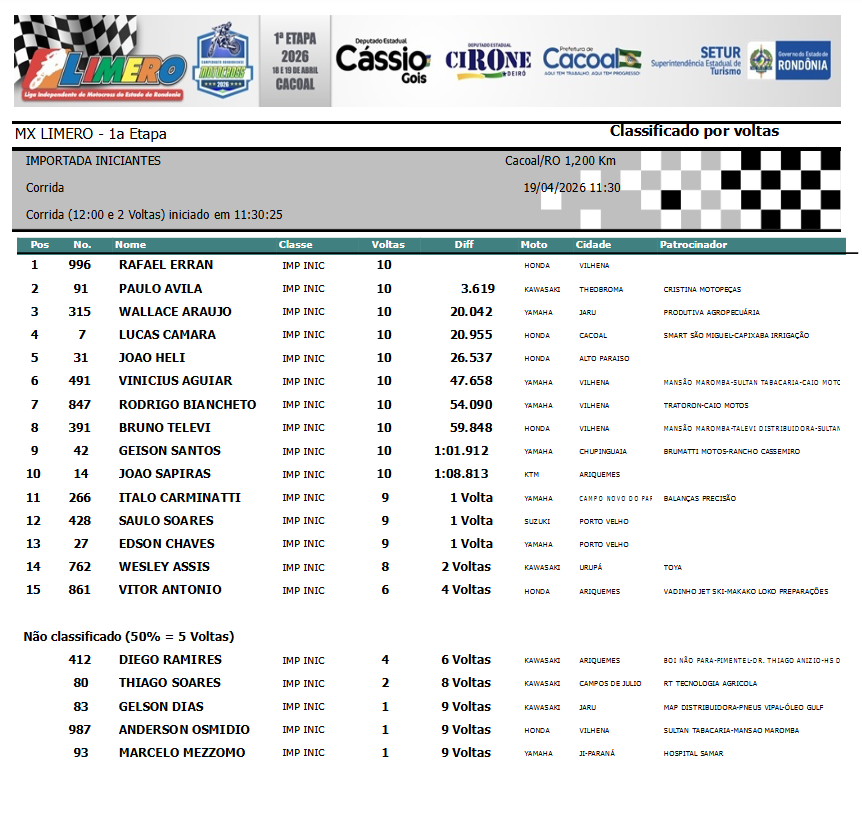 Na categoria Importada Iniciante, o domínio foi de Rafael Erran #996, representante de Vilhena. Em segundo lugar, cruzou a linha de chegada o piloto Paulo Avila #91 (Theobroma) com sua Kawasaki. A terceira colocação ficou com Wallace Araujo #315, de Jaru, a bordo de sua Yamaha.