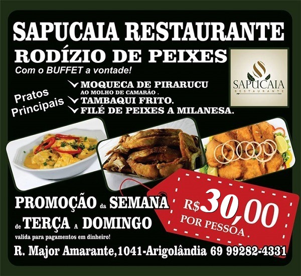 Aberto de terça-feira a domingo o restaurante Sapucaia conta com o melhor rodizio de peixes da cidade por apenas R$ 30,00 por pessoa.